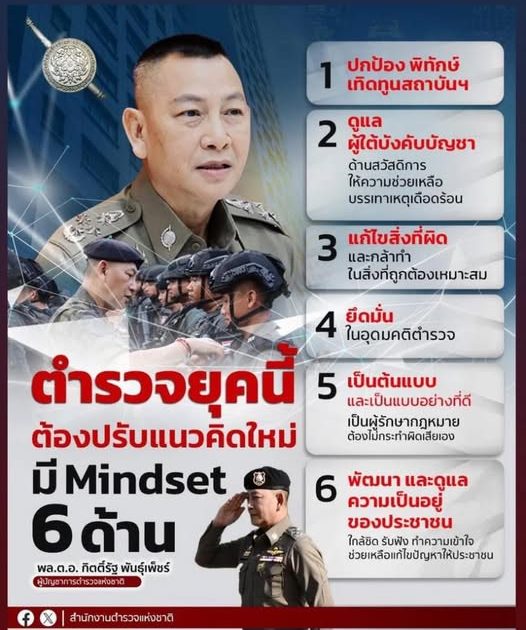 ตำรวจยุคนี้ต้องปรับแนวคิดใหม่: ** - Mindset 6 ด้าน ที่ พล.ต.อ. กิตติ์รัฐ พันธุ์เพ็ชร์ ผู้บัญชาการตำรวจแห่งชาติ นำเสนอ เพื่อยกระดับการทำงานและการให้บริการแก่ประชาชนอย่างมีประสิทธิภาพ พร้อมสร้างความเชื่อมั่นในกระบวนการยุติธรรม: