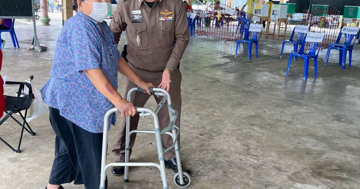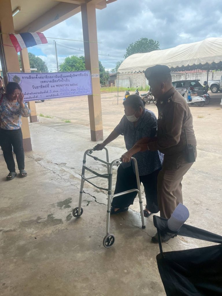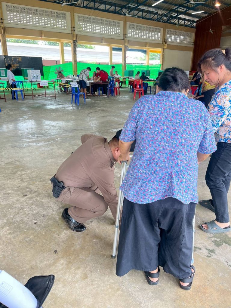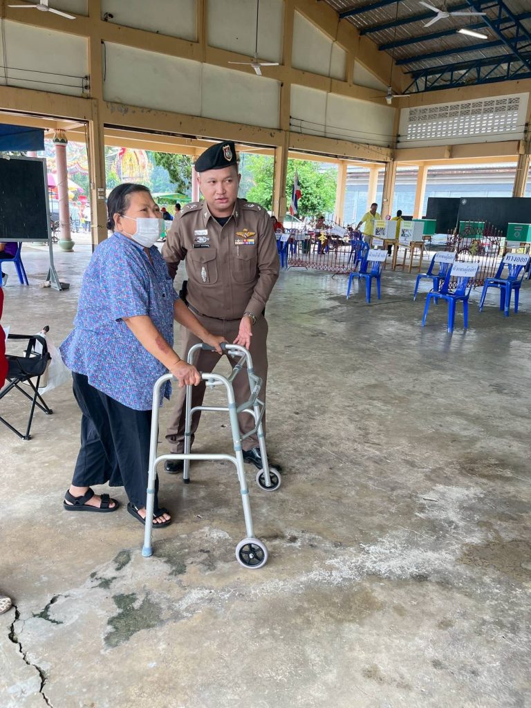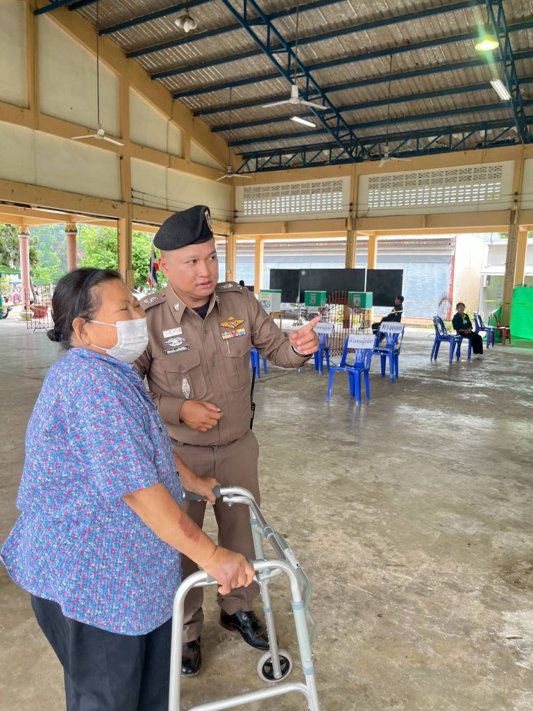 พร้อมเจ้าหน้าที่ให้การดูแลความปลอดภัยและ ช่วยพยุงผู้สูงอายุเดินไม่สะดวกเข้าหน่วยเลือกตั้งอย่างอบอุ่นและปลอดภัย ![]()