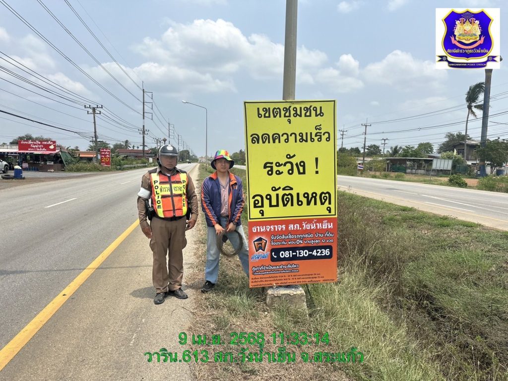 วันที่ 9 เม.ย. 2568 เจ้าหน้าที่ตำรวจจราจร สภ.วังน้ำเย็น ดำเนินการ ติดตั้งป้ายจราจรจำนวน 10 ป้าย ที่ได้รับมอบจากผู้จัดการสินเชื่อ ศรีสวัสดิ์ เพื่ออำนวยความสะดวกและลดอุบัติเหตุบนท้องถนน ในช่วงเทศกาลสงกรานต์นี้ ขอบคุณน้ำใจจากภาคเอกชนที่ร่วมสนับสนุนความปลอดภัยของประชาชน