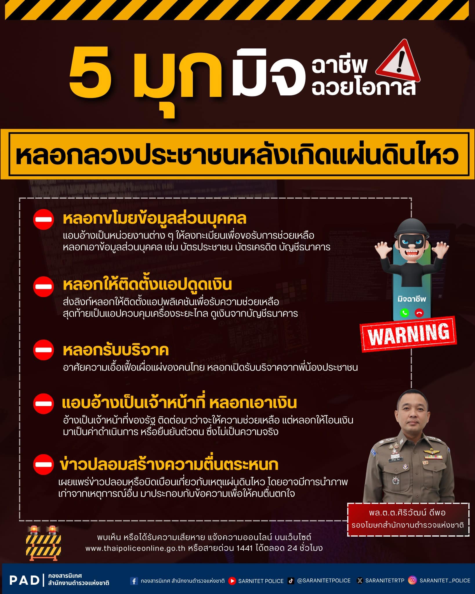 สำนักงานตำรวจแห่งชาติ เตือน 5 มุกมิจฉาชีพ ฉวยโอกาสแผ่นดินไหว ซ้ำเติมประชาชน วันนี้ (30 มีนาคม 2568)